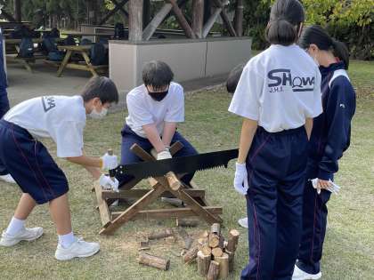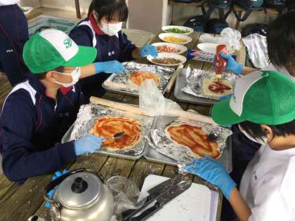 丸太切り、薪割りから始め、いよいよ、ピザ作りです。楽しく、美味しく、いただきます。