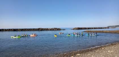 マリンスポーツ班の活動が始まりました。元気よく海へ漕ぎ出します。
