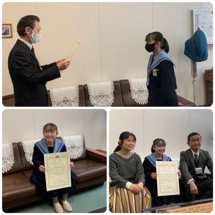 3年生の若林さんが「これからの地球のために」という題で、税についての作文「大阪府なにわ南府税賞」を受賞し、立派な賞状と記念品をいただきました。これは全国納税貯蓄組合連合会と国税庁が中学生対象に実施しているものです。