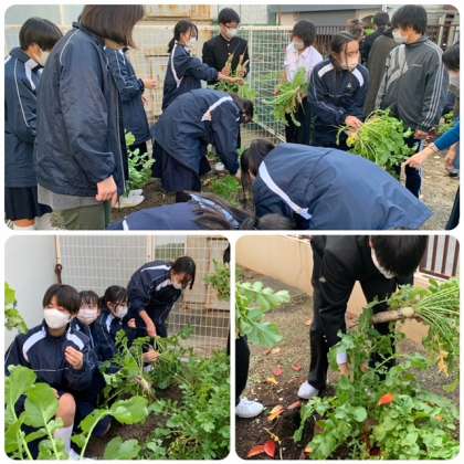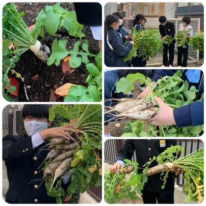 ふれあい委員会の活動で、田辺大根を収穫しました。大小さまざまな大根が育ち、中には人の形をした大根もありました。生徒たちで分けて持って帰りました。大根も葉っぱもおいしく食べてくれると思います。(ふれあい委員会担当教員)