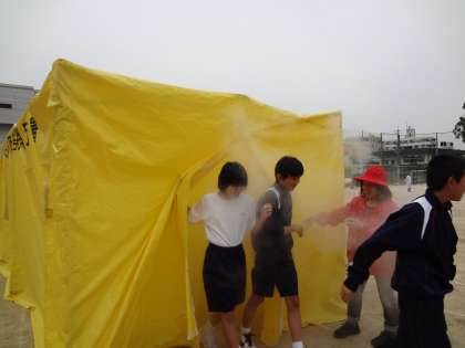 避難訓練後は、各学年に分かれて取り組みを行いました。2年生は運動場で、防災訓練です。「煙体験」「応急処置」「水消火器訓練」など、地域の方々にご指導いただいての実地訓練です。参観に来られた保護者の方にも体験していただきました。