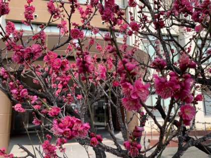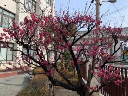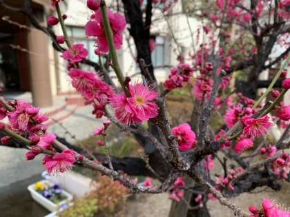 紅梅の木が濃い桃色の花を咲かせています。5分咲きくらいでしょうか、木全体が美しく艶やかに染まっています。