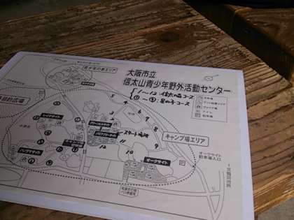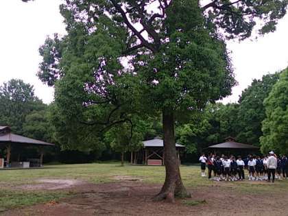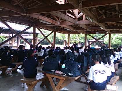 昨夜の豪雨もおさまり、小雨になりました。予定どおりオリエンテーリングをします。先生からの説明をしっかり聞いて、さあスタートです。
