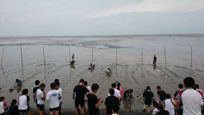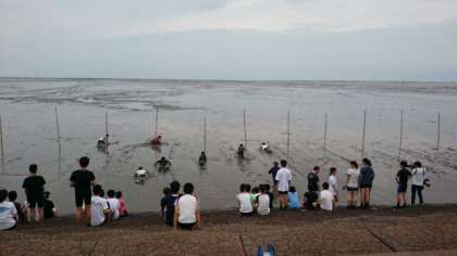 ガタスキー、スタートしました。最初はこわごわ乗ったガタスキー。泥に入った瞬間には怖さもなんのその、みな必死です。