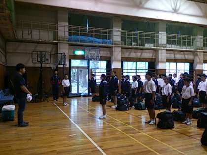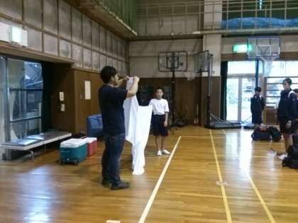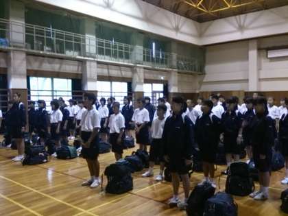 信太山青少年野外活動センター 青少年の家 入所式。一泊移住委員がしっかり、司会進行。みんな大きな声であいさつが出来ました。シーツは、普段とは違うものです。入室後は、体育館で室内オリンピックです。
