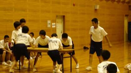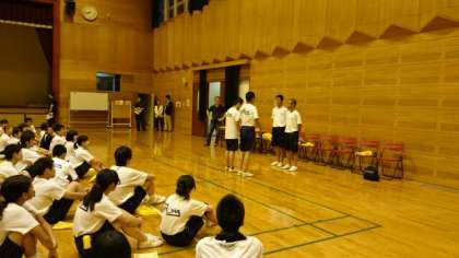 ホテルに入館後、入浴、夕食に続き、レクリエーション大会が、始まりました。各学級代表の誓いのことば、選手による腕相撲が行われています。