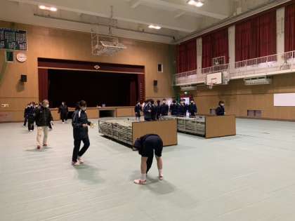 入学式を明日に控え、在校生が登校して会場準備をしました。