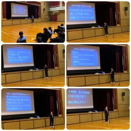 始業式では、校長先生がプロジェクターを使って、昭和中の校訓とめざす生徒像、中学生で身につけてほしいことなどのお話がありました。