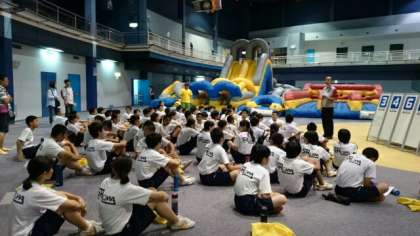 スペースロッジに到着。入館式、着替えを済ませ、これからスペースキャンパス体験です。さて、どのようなことをするのでしょう?ワクワクドキドキ。