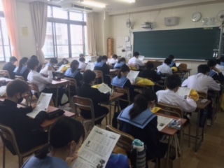 4月25日の生徒集会は、全校生徒による新聞を読もうの日を開催しました。総務省の調査では、10代が平日新聞を読む時間は、平均18秒だそうです。現在では、テレビやネットでの情報を得ることが多く、新聞からの情報を得るのは少なくなってきています。全校生徒で同じ新聞を読むことで、さまざまな感じ方があることを知ることが大切だと考えて、宮崎県から月1回発行されている日本講演新聞ジュニア版を生徒会主催で読むことになりました。感想文をこの新聞社に送り交流ができればと思っています。
