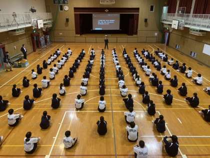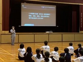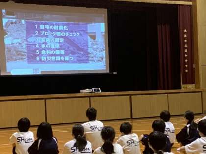 阿倍野区役所防災担当の方からご挨拶をいただき、その後DVDを視聴して地震に強い家屋や家具の固定の仕方を学びました。