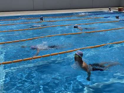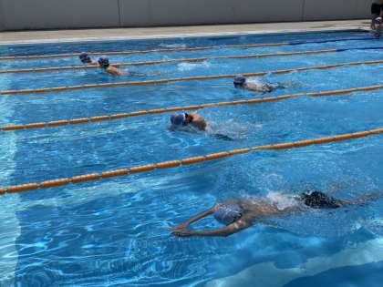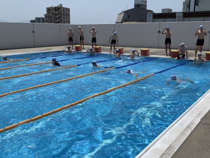 晴天の中、体育館屋上にあるスカイプールで、水しぶきを上げて元気に初泳ぎをしました。