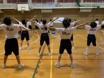 グループごとで、ラジオ体操第2の動作を撮影し、見本の動画と比較したり、自分たちの動きの修正ポイントを確認しました。