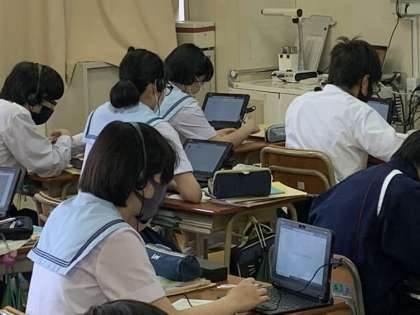 文法導入のパワーポイントで、演習解説動画や英語が得意な生徒へのプラス問題を、生徒はヘッドセットをしながら学習しました。