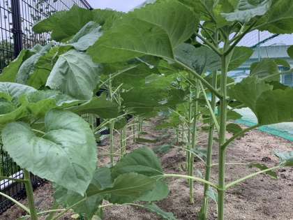 1週間前は50cmほどだったひまわりの草丈が、一気に90cmほどに成長しました。日当たりの良い場所で2m越えの巨大ひまわりが咲きそろう日が待ち遠しいです。