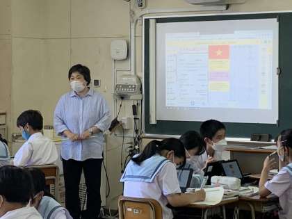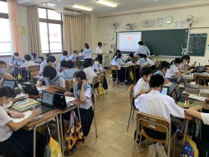 東南アジアの文化について調べ学習を行う中で、インターネットの信憑性についても学んだ。調べたものをコラボノートEXを使って班でまとめ、同時にサイトの検証も行った。割り当てられたテーマについて発表を行いました。