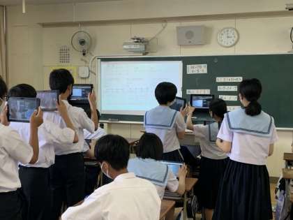 問題の正解をあらかじめ作っておいたマークシート方式の解答画面に入力を行いました。そのことで学習者にリアルタイムで正答率を把握することができました。講義形式で三元一次方程式の連立方程式の解き方を、ノートを書かずに学びました。それを学習者用端末で撮影し、それを見て各自が復習を行いました。