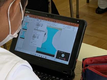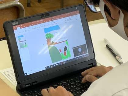 Power Pointのタッチペンを使って配色のシュミレーションを行いました。各自が思い描くポスター作品の写真のスライドをベースにしながら描画撮影を活用し、配色を検討していきました。Power Pointの文字編集を用いて、文字のデザインも行いました。