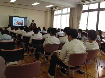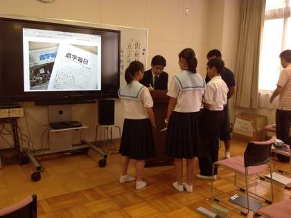 1年生は総合的な学習で「福祉」について学んでいます。前回、コクヨの方から「ユニバーサルデザイン」についてのお話をうかがいました。今回は週刊新聞「点字毎日」の記者の方に出前授業をしていただき、点字による記事の内容や発刊までの苦労について教えていただきました。生徒たちはみんなしっかりメモをとり、耳を傾けていました。授業終了後、記者から生徒への取材もありました。