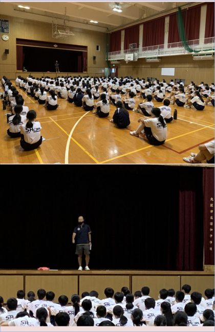 先生から今日の流れと注意事項を聞いた後、生徒は赤団・青団・黄団・緑団の4つに分かれて、応援パフォーマンスの練習を行いました。夏休みから取り組んできた応援リーダーが中心となって、音楽を流しながら学年の枠を超えて他の生徒に演技を教えました。