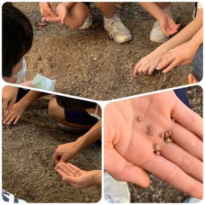 一人ひとりが種を握りしめて、目印として立てた竹ひごのところに植えていきました。