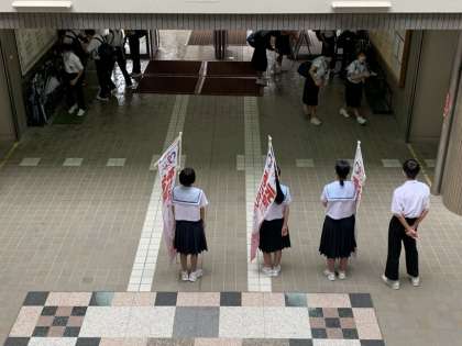 平素は、通用門前道路に出て、生徒会役員があいさつ運動をしていますが、今日は雨が降っているためにピロティーで登校してくる生徒にあいさつをしました。