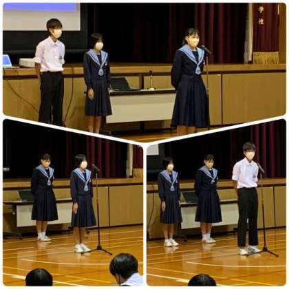 昭和中学校の顔として半年間全校生徒を引っ張ってくれた前期生徒会役員の3人が一人ひとり最後のあいさつをしました。熱い思いと行動力で学校のために力を発揮してくれてありがとうございました。引き続き後期生徒会をサポートしてあげてください。