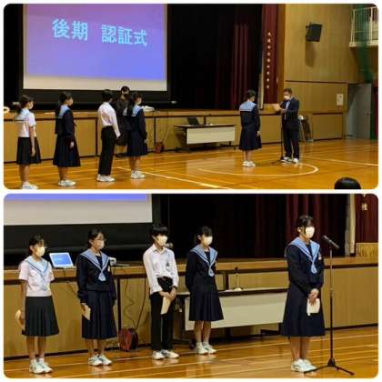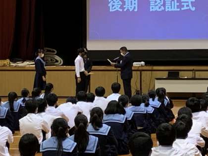 全クラスの学代を代表して3年2組の学級代表が認証状を受け取りました。学級のまとめ役としてよろしくお願いします。
