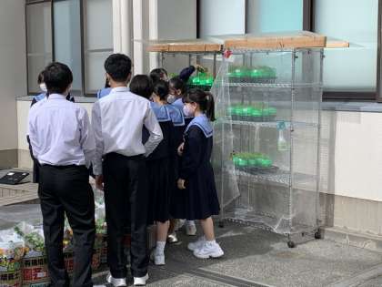 3年生は昼の休み時間に玄関においてあるサラダ水菜の観察と水やりをしています。