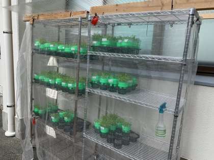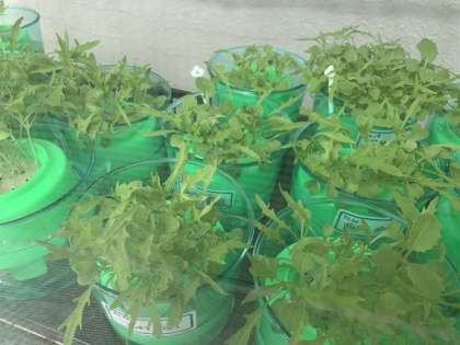 一人1個のポットにサラダ水菜の種を植えたところ、どのポットからも3日目ぐらいから発芽して2週間で現在のように成長しています。