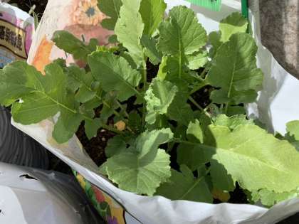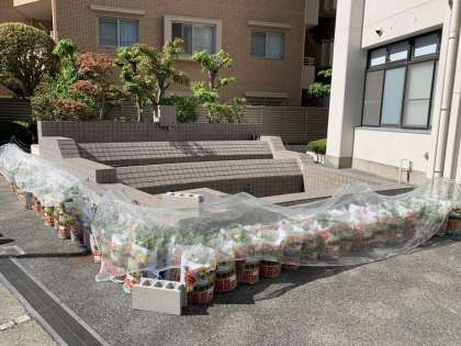 9月上旬に、園芸の土(25リットル)袋の片方を切り取り、そこに直接種を蒔き、昼休みに玄関に出て水やりを欠かさずおこないました。その結果、写真のように成長しています。