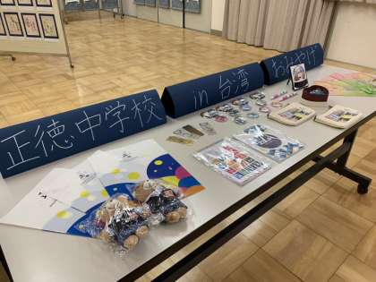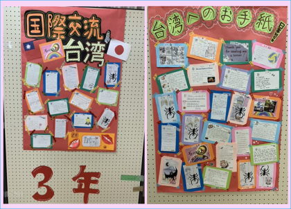 3年生はハガキに日本のことやアニメなどを紹介し英語で返事しました。ノベルティグッズも展示しています。