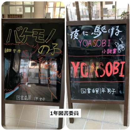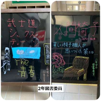 図書委員会活動で学年ごとに、生徒の皆さんに読んでほしい本をブラックポードに見やすく描きました。たくさんの本を読むことで、知識が広がり、人の気持ちが汲み取れ、様々な疑似体験をすることもできます。