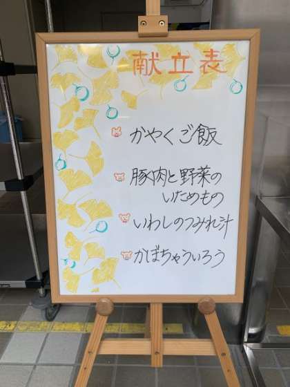 メニューボードも秋の装いで、配膳員さんが美しく描いてくださいました。