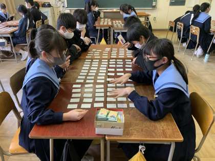 クラスを6班に分けて、6〜7人で一班になり、百人一首の練習をしました。テープに流れる声に耳を澄まし、札に目をやり一斉に探しました。