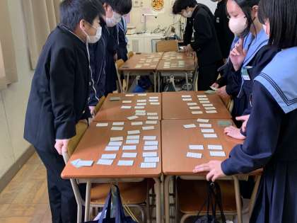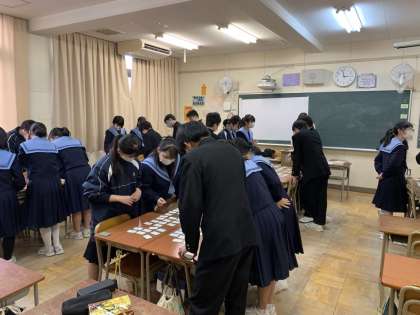 学活の時間を活用して、2年生は百人一首をおこないました。先生の読み上げに生徒は耳を澄まし、一斉に班で取り札を探しました。