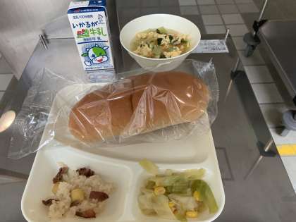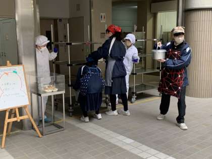 給食当番は食器等を取りに来た時に、メニューボードと盛付見本を見て、教室前廊下で配膳をしています。