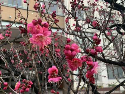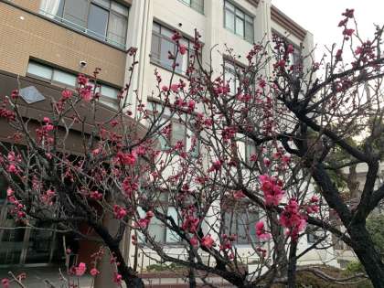 今年も春の訪れを感じさせる紅梅の花が、木々の第1号として正面玄関に咲き始めています。名の通り、やや紫みのある紅色です。ひと雨ごとに暖かくなってきているようです。