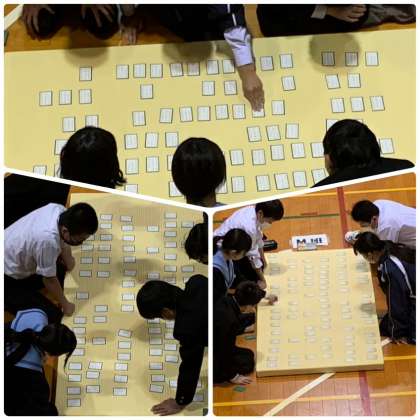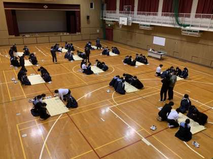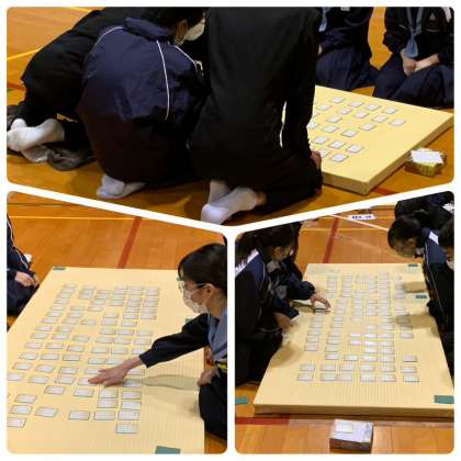 体育館は70人を超える生徒がいると思えないほど静寂に包まれ、和歌を詠むテープの声だけが朗々と流れていました。生徒は姿勢正しく正座の姿勢から和歌が流れると前のめりになり、大きな声で「ハイ!」と言って札を取り合いました。