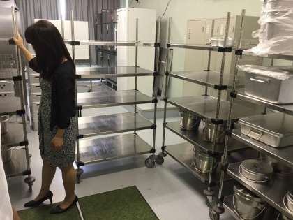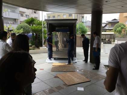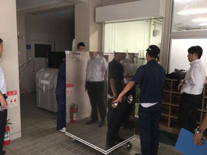 9月2日の「親子方式による学校給食」スタートに先立って、給食搬入のシミュレーションが実施されました。大阪市教育委員会の担当の方々立会いのもと、配送業者により本番と同じ手順で長池小学校から昭和中学校へ食缶等が搬入され、本番に向けての確認が行われました。