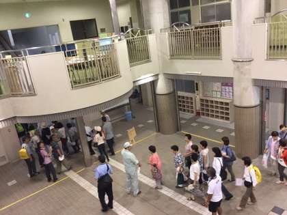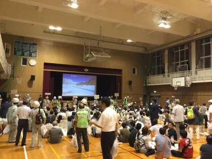 8月22日(土)夜間に震災が起こった場合の避難、収容避難所開設を訓練することを目的とした、長池地活協主催の「長池まちなか防災訓練」が行われました。午後7時前に地震が発生、家屋の倒壊・火災の恐れがあるという設定のもと地域住民の方々が本校体育館に避難してきました。体育館では地活協会長や阿倍野区長のあいさつの後、DVDを観たり区役所の担当による防災の説明がありました。最後に町会ごとに収容避難所となる本校の校舎内を見学し、防災訓練を終えました。
