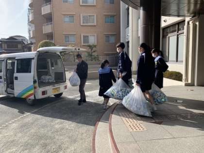 校長室前で、この1年間回収してきたエコキャップが8袋分(50Kg程)も集まり、大阪市立中央授産場に連絡して引き取りに来てくださり、生徒会役員がその袋を車まで運びました。