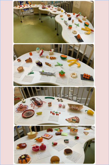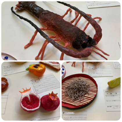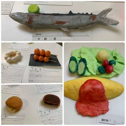 1年生の美術の授業で、色や形を見つめて軽量紙粘土を使って本物そっくりな食べ物の造形を制作しました。