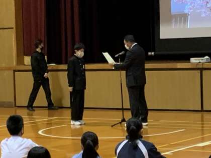 本校の1年男子生徒が、大阪市オープンけん玉道選手権大会においてみごと優勝を果たし賞状をいただきました。この大会は年齢関係なく大人も出場していて、その中での優勝です。おめでとう。