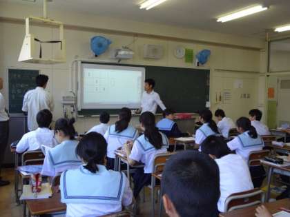 数学の先生2名でのチーム・ティーチング、ICT授業つくり指導員とともに電子黒板を用いて、魔法陣の説明を聞きました。