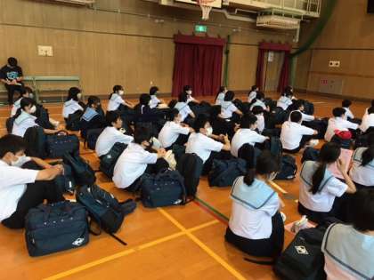 6月7日、6限目体育館において、明日から始まる一泊移住の事前指導が行われました。行程と持ち物の確認を行い、準備万端です。後は、天候のみ、晴れが少しでも続きますように!
