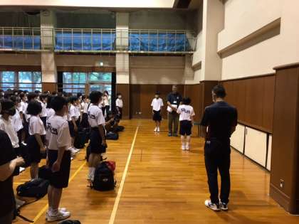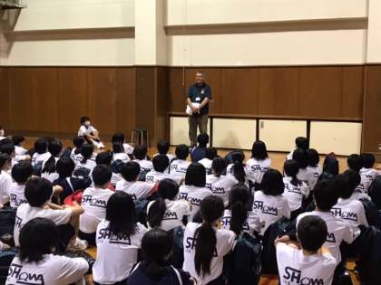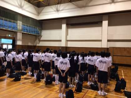 クラスビルディングの取り組みが終了し、次は入所式です。生徒代表者のあいさつがあり、施設の代表者からお話がありました。この後は、夕食です。