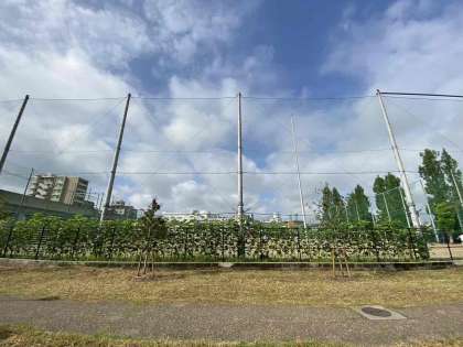 4月に緑花部会のみなさまと協力してくれた生徒で植えたひまわりが、青空のもと開花しました。桃ヶ池側からもきれいに見えます。