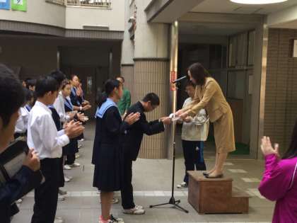 全校集会の際に後期生徒役員・学級委員の認証式を行いました。生徒会長はじめ4人の生徒会執行委員と学級委員の代表として3年2組の男女学級代表に、学校長から認証書が手渡されました。それぞれ役員・委員としての自覚をもって、責任を果たしてくれることを期待しています。