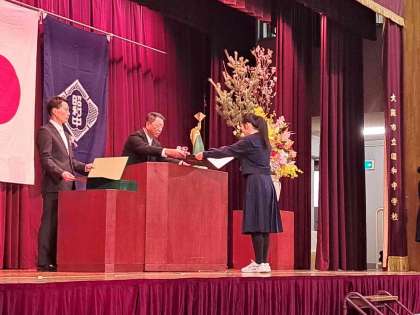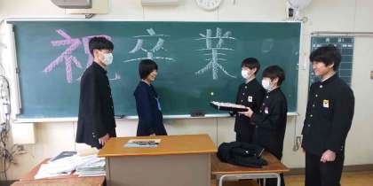 第77回卒業証書授与式を挙行いたしました。朝に、三年生の各クラスに生徒会の代表からコサージュが届けられました。そのコサージュを胸に、卒業式に向かいました。
